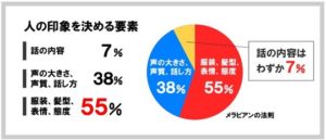この法則を見るとわかるように、「視覚情報」は55%を示しており、話し手の表情や仕草、見た目がいかに人の印象を決めているかがわかるかと思います。